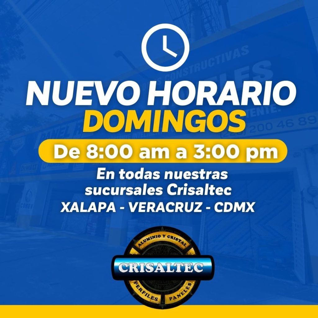 ¡Les informamos nuestro nuevo horario los domingos en todas nuestras sucursales #Crisaltec! Los esperamos de 8:00 a.m a 3:00 p.m #ConstruyeInteligente #Xalapa #Veracruz #CDMX #Construcción #ConstrucciónLigera #PanelesDeYeso #PerfilesDeAceroGalvanizado